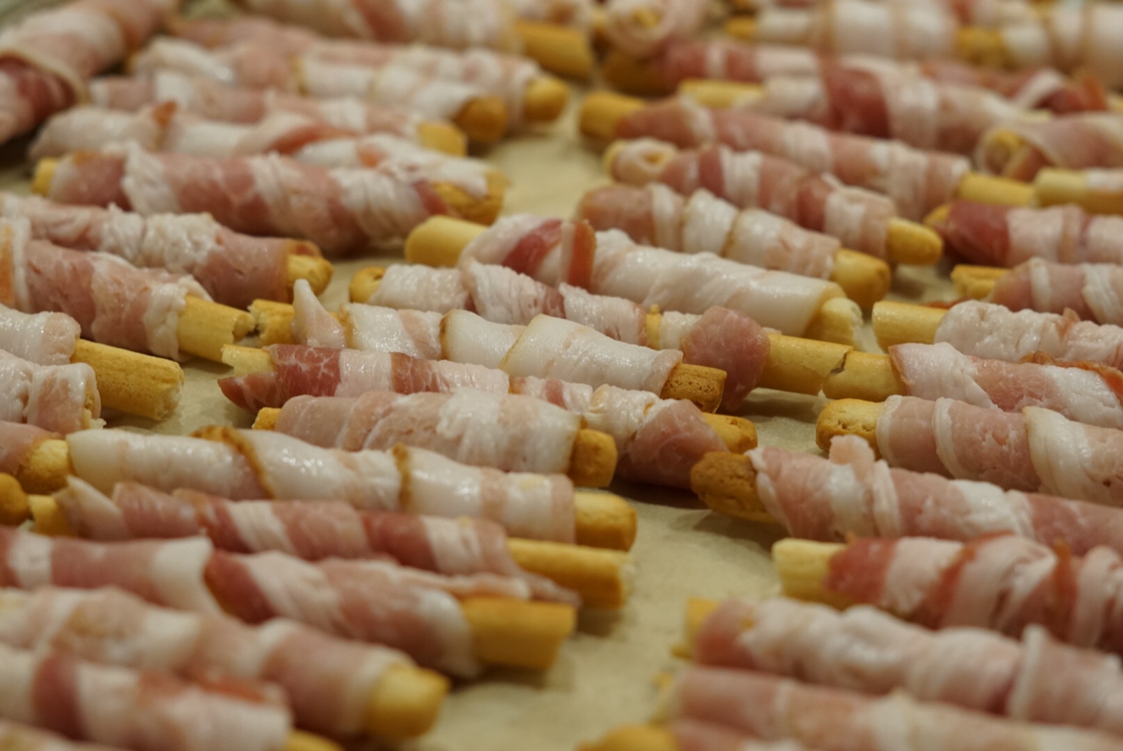 4. Wrap each grissini in a piece of bacon, going diagonally down so you are covering as much of the grissini as you can!