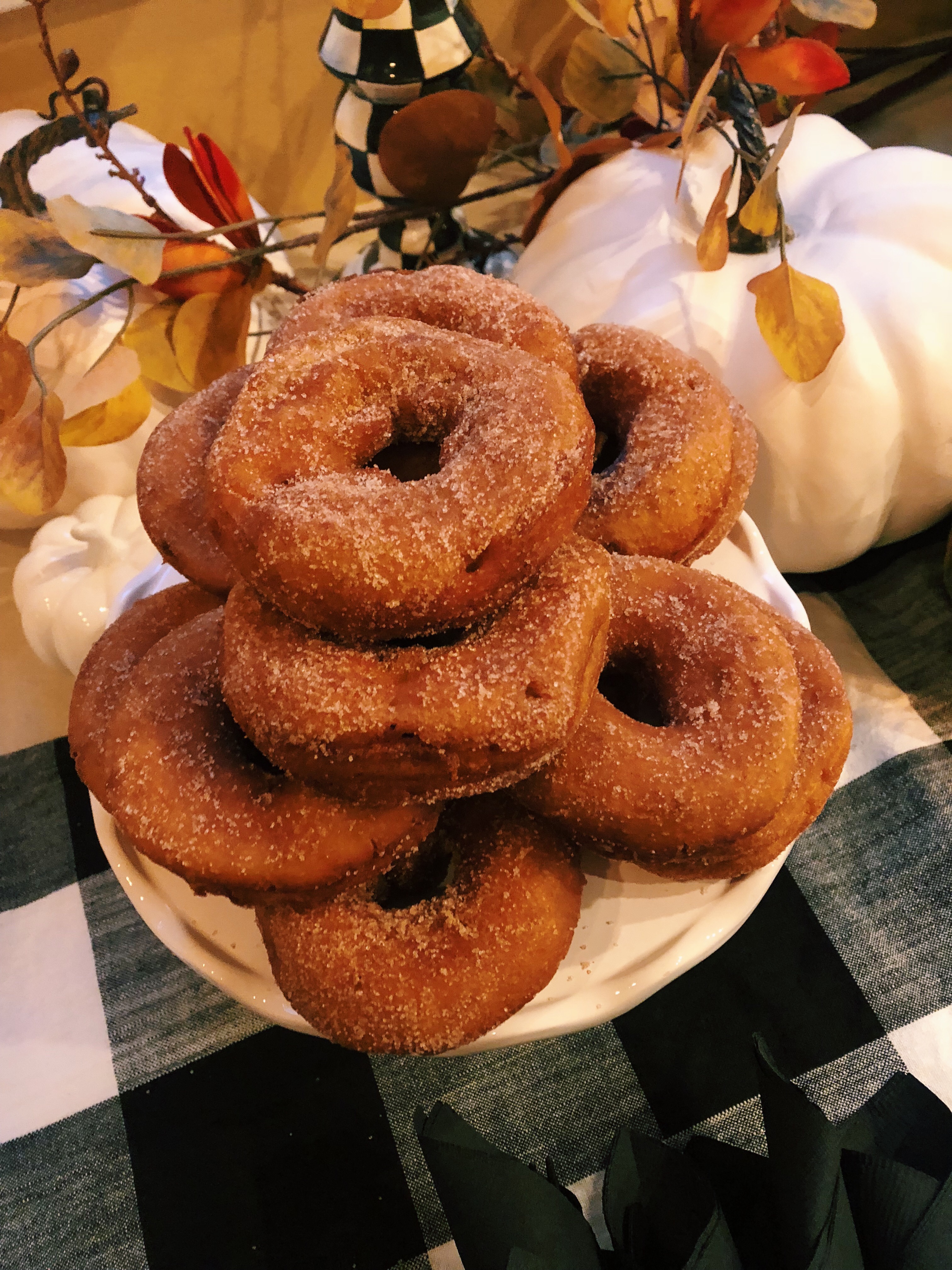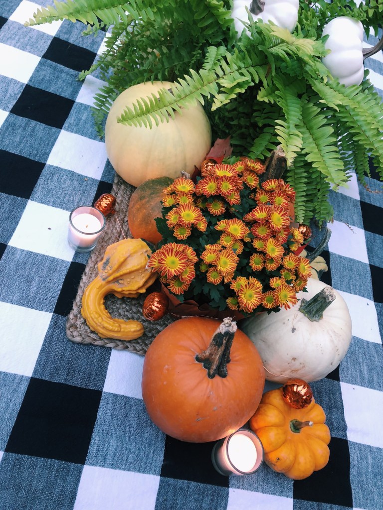For the tablescape, we started with a black gingham tablecloth, added a natural runner, a Boston firm left over from the Summer in the center and surrounded it with a couple orange and yellow mums, big and small pumpkins, and gourds.