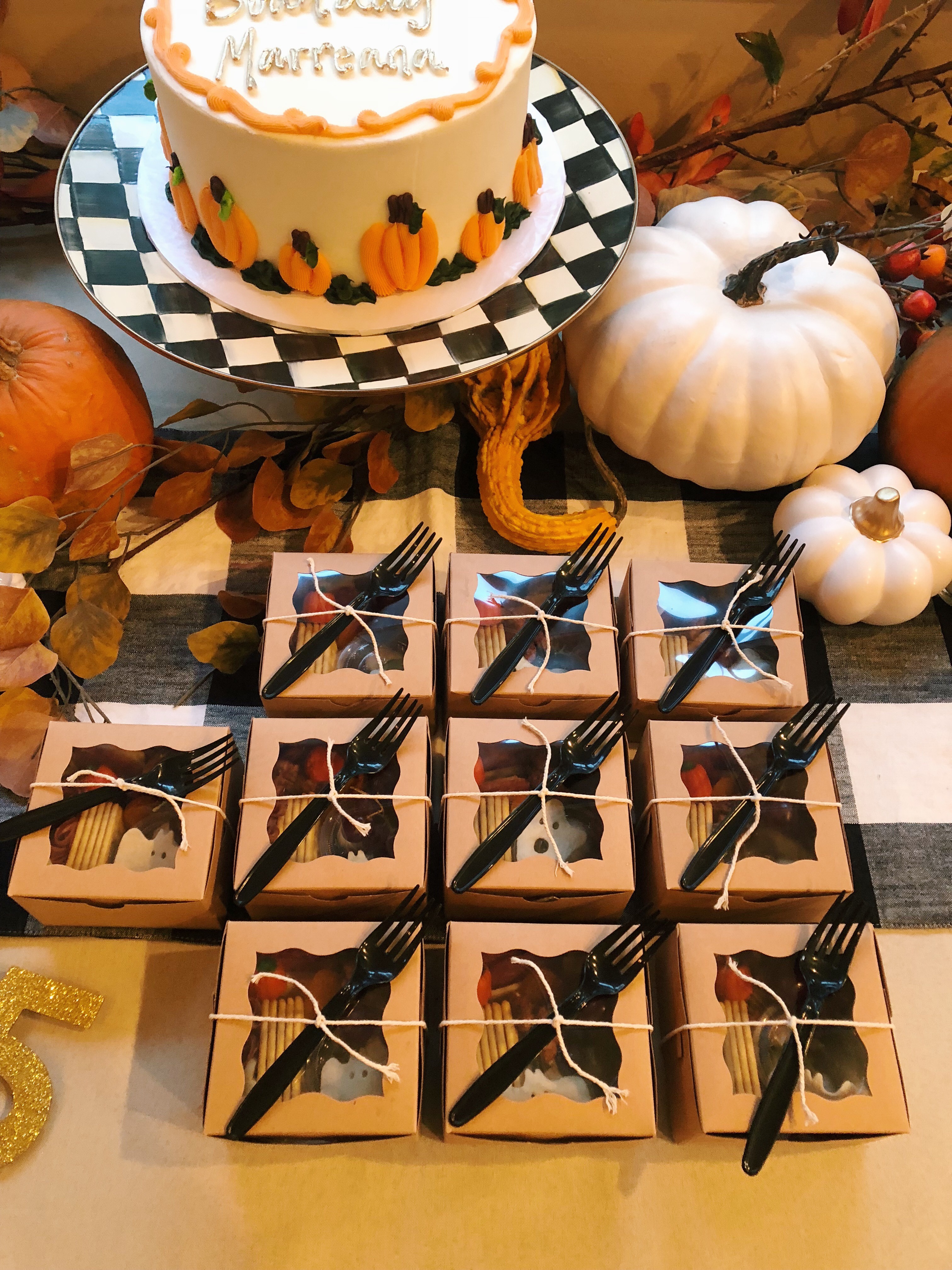 For Marreana’s birthday we wanted to celebrate with a few friends and take advantage of the last of the fall weather! Before the party we headed to our local pumpkin patch to pick up some fall decorations. We found pumpkins in different colors and sizes to place on the tables and around the yard. We also set up a couple of fire pits and heaters outside to keep warm. From a delicious cake to individual charcuterie boxes the food was all yummy and on theme. Keep reading to see all of our fall fest party details!